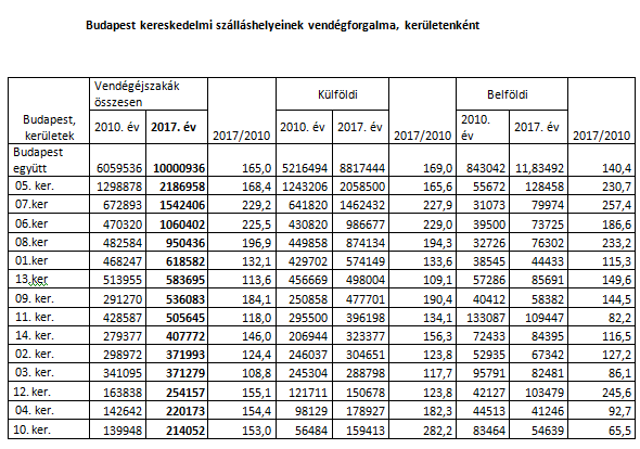 A budapesti kereskedelmi szálláshelyek vendégforgalma elsősorban a pesti oldal belvárosi negyedeibe koncentrálódik, az első budai kerület csak az ötödik helyre fér be. 14 olyan kerület van, ahol a vendégforgalom eléri a 200 ezer éjszakát, közülük 3 az 1 milliót is meghaladja. A forgalom 2010 és 2017 között dinamikusan növekedett, egyedül a 15. és a 22. kerület forgalma esett vissza.