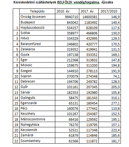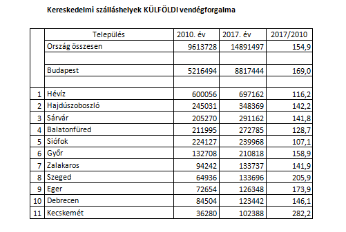 A 2017.év kiemelkedően sikeres esztendeje volt a magyar turizmusnak. Soha nem látott mértékben (közel 8 %-kal) nőtt a külföldiek érdeklődése Magyarország iránt. A kereskedelmi szálláshelyeken megugrott a belföldi vendégforgalom (5,6%). Kétszámjegyű (15,6) volt a bevételek (466 milliárd forint) gyarapodása, és lényegesen nagyobb (59,6) volt a szállodák foglaltsága is.