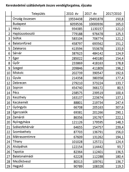 Az országban 29 olyan település – Héviztől Hegykőig – van, továbbá 9 olyan budapesti kerület és 8 balatoni település, amely 100 ezer éjszakánál nagyobb forgalmat élvezhetett. Budapest 6. és 7. kerületében, továbbá 5 egyéb településen 2010-hez képest több, mint duplájára nőtt a vendégforgalom. A teljes vendégforgalom tekintetében évek óta Héviz, Hajdúszoboszló, Siófok, Balatonfüred, Zalakaros a sorrend. Budapest az országos forgalom egyharmadát teszi ki, belvárosi kerületei egy elképzelt rangsorban a legtöbb települést is megelőznék.
